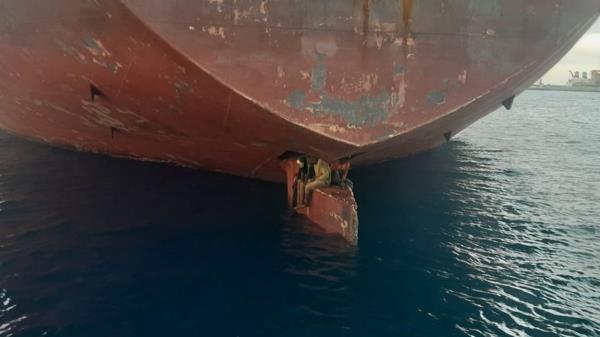 - 令人震惊的照片显示,三名偷渡者在油轮舵上呆了11天后获救