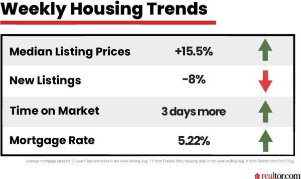 来自Realtor.com的最新7月份数据显示,全美房价中位数为44.9万美元。截至8月6日的一周,挂牌价格较去年同期上涨了15.5%。