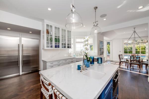 厨房有定制的橱柜、大理石岛台和高端电器。厨房和家庭娱乐室都通往后院。