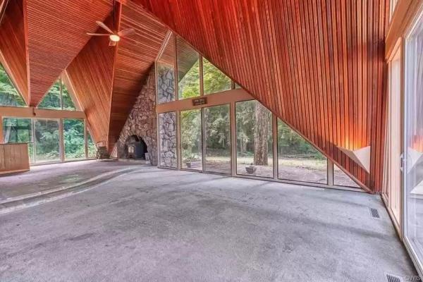 这座住宅占地76.16英亩,有七间卧室。它的特色是彩色玻璃窗、玻璃墙和一个锦鲤池。