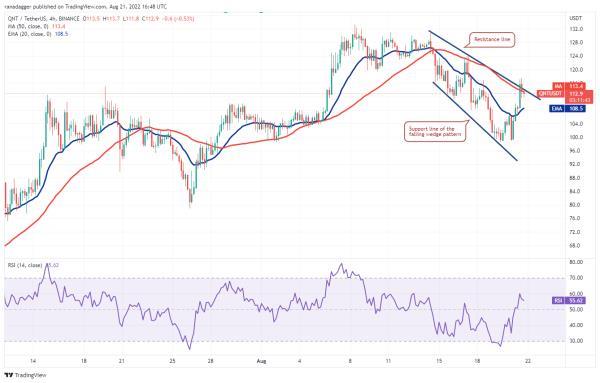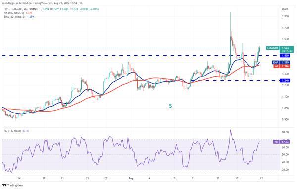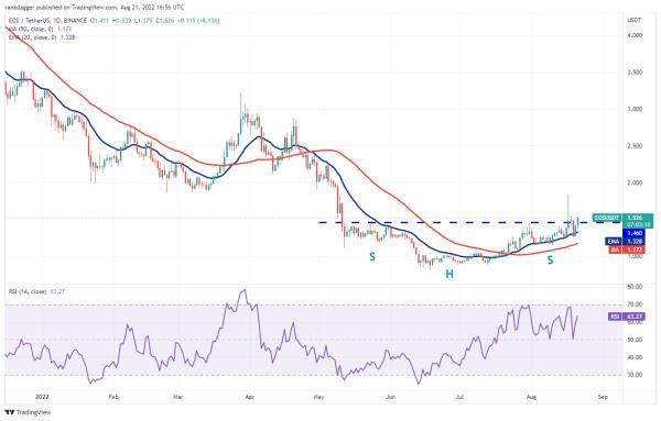 空头将价格压低至8月19日的1.46美元突破水平,但有积极迹象表明,买家不允许EOS/USDT货币对跌破20日均线(1.32美元)。这表明,较低的水平正在吸引买家。