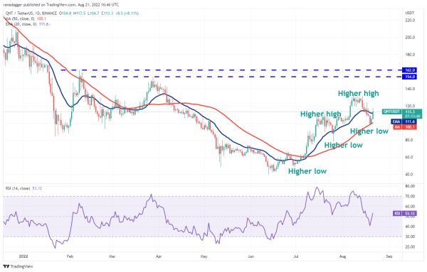 一系列上升的高点和上升的低点表明,量化宽松(QNT)处于短期上升趋势。多头希望在跌至他的50天SMA(100美元)时买入,并恢复反弹。