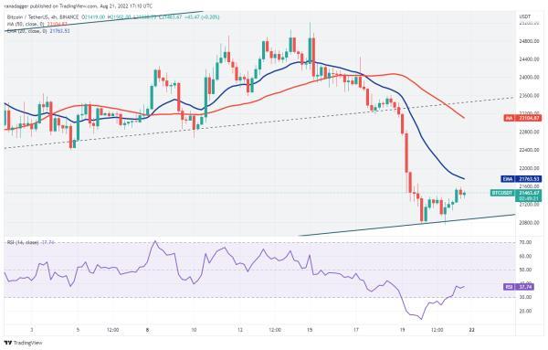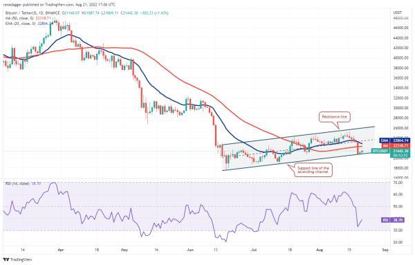 8月17日,比特币跌破20天指数移动平均线(22,864美元),8月19日跌破50天简单移动平均线(22,318美元)。通道。