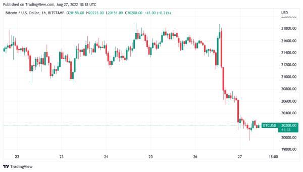 8月26日,在美联储就经济政策发表强硬言论后,比特币(BTC)和替代币大幅下跌。