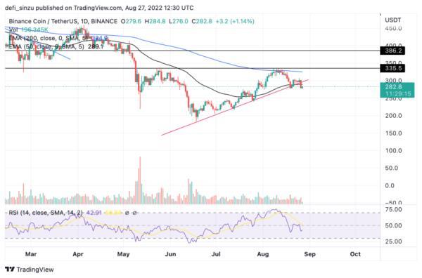 根据图表,BNB价格触及220美元的周低点。BNB价格从该地区迅速反弹,升至330美元的周低点。这是因为在337美元被拒绝后,价格没有显示出上升趋势,这是一个星期的阻力。