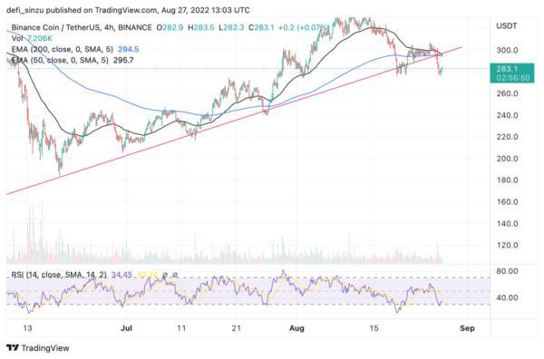 BNB价格在290美元被拒绝后仍然坚挺,这是一个阻力。BNB价格在50和200均线以下交易,对应295美元,作为对BNB价格的阻力位。