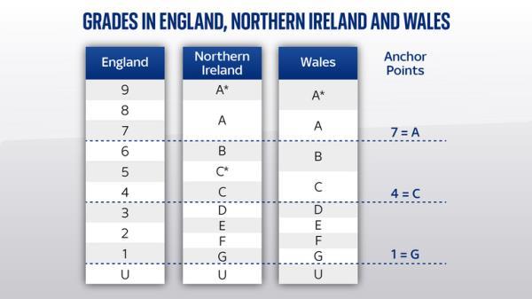 在英国,传统的A*到G的评分被9比1的评分系统取代,9是最高分数。