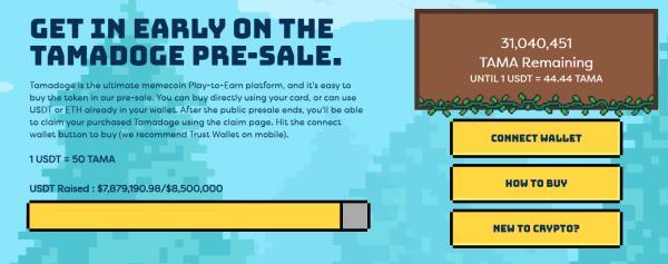 加密货币通常不会对市场情绪做出显著反应,而是依靠成功的预售和营销活动。因此,在预售期间投资它们是在价格下跌期间保护你的投资组合的一种有利可图的方式。USDT,即法定货币。目前,1 USDT相当于50 TAMA。然而,一旦Tamadoge筹集到剩余的5900万美元,1 USDT相当于44.44 TAMA。