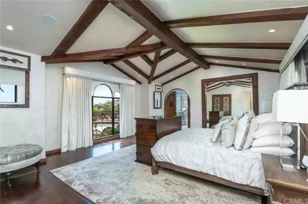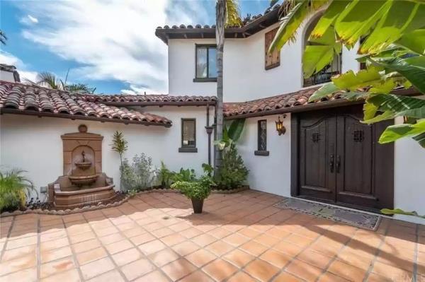 房前有一座铺着西班牙瓷砖的庭院和喷泉,而富丽堂皇的室内装潢则以深色木地板和裸露的横梁为特色。