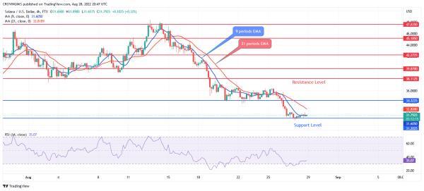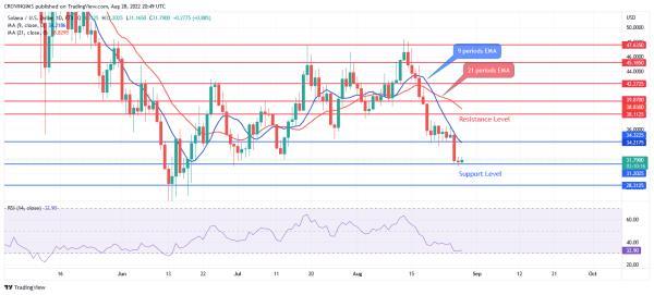 索拉纳是日线图上的看跌走势。上周油价触及34美元支撑位时出现了盘整走势。8月26日,卖家压力增加,形成了一个强大的看跌烛台,打破了34美元的水平下跌。索拉纳价格下降到31美元支持水平。来自卖家的进一步压力可能会将价格压低至28美元的水平。