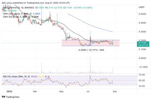 从图表上看,ADX价格在一周图表上看起来很低,在大幅上涨到1.2美元的高点后,然后螺旋式下降到0.16美元区域。