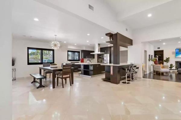 毗邻美食厨房的用餐区顶部有一盏闪闪发光的吊灯。此外,厨房配备了一个大岛台和一个内置的带座位的早餐吧。