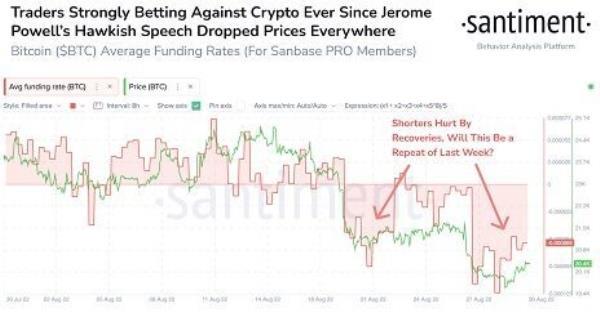 加密货币分析公司Santiment发布了以下显示BTC平均融资利率上升的图表,显示人们对比特币的情绪仍然是不利的。