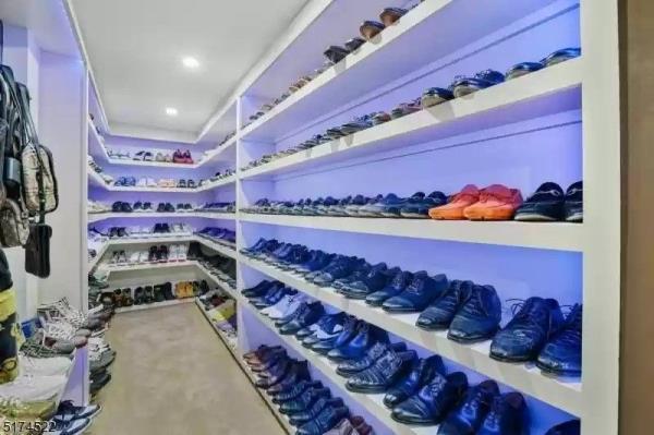 豪华的主套房有自己的定制鞋柜,从地板到天花板都摆满了一排排的鞋子。
