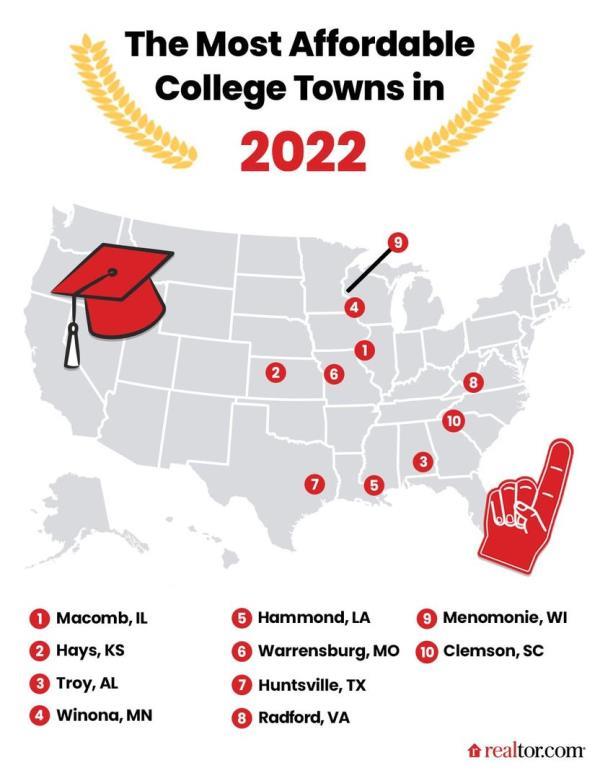 一些最实惠的大学城——伊利诺伊州的麦库姆(排名第一)、堪萨斯州的海斯(排名第二)和密苏里州的沃伦斯堡(排名第六)——位于美国心脏地带的小社区。这些城市的居民都只有15000到21000人,其中三分之一是大学生。