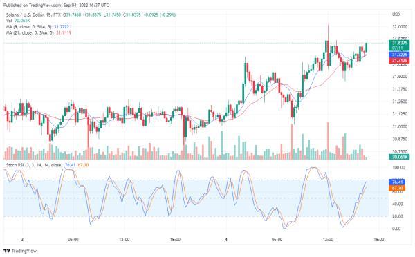 随着这种情况的持续,价格走势似乎正在逼近布林杰中心线。如果买家保持强劲,上升趋势继续建立势头,索拉纳的价格将超过Bollinger的中线。在那之后,油价可能很快就会超过36美元。