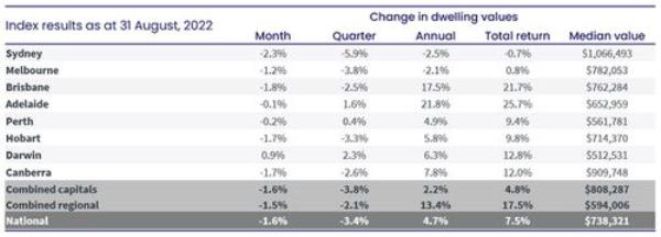 CoreLogic的全国房屋价值指数8月录得连续第四个月下跌,房价加速回落,覆盖澳大利亚更多地区。