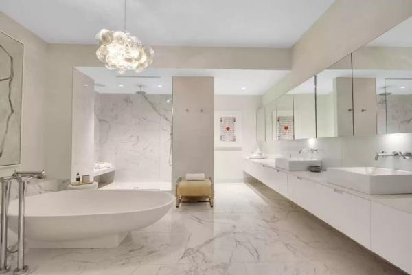 Frankel创造了一个真正的撤退,有一个神圣的浴室,有两个梳妆台,一个枝形吊灯,一个浴缸和淋浴。还有一个步入式衣帽间和“美容室”。