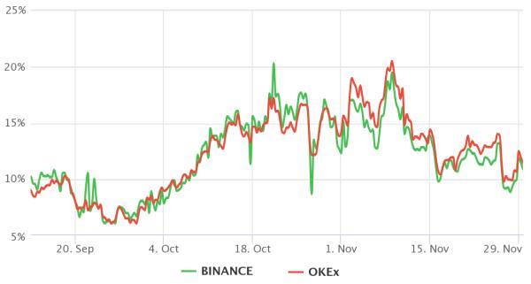要了解看多或看空专业交易员的仓位,我们需要分析期货基准利率。这一指标也被称为期货溢价,衡量的是期货合约与常规交易所当前现货市场之间的差异。
