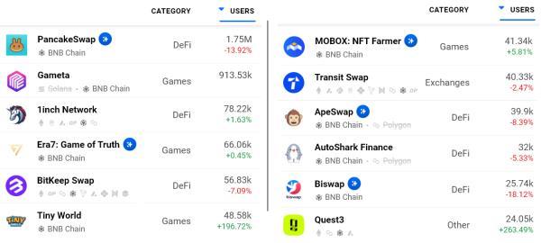 要了解BNB链的TVL的下降是否伴随着用户的减少,投资者应该分析去中心化应用(DApp)的使用指标。他的一些dapp,如游戏和收藏品,不需要大量押金,所以在这些情况下,TVL指标是无关紧要的。