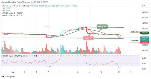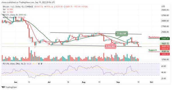 比特币价格在略高于19,500美元之后,跌破了9日和21日移动均线。此外,在今天的交易中,该币试图推高,但卖家进行了干预,并开始降低该币,触及18,255美元的日低点。