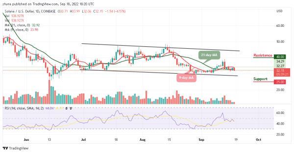 SOL/美元可能不会跟随看涨走势,因为该货币低于9日和21日移动均线。索拉纳的价格目前为32.15美元,在撰写本文时,他正面临着33.99美元的通道低点。