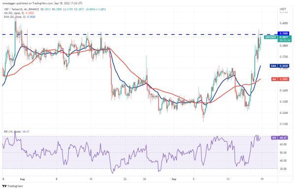该货币对从0.32美元飙升至0.39美元,显示多头买盘强劲。20-EMA正在上升,RSI位于正区域,表明阻力最小的路径是向上的。