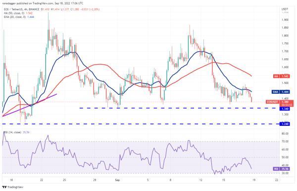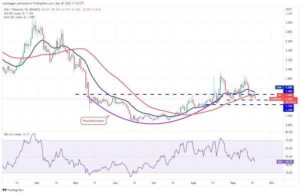 9月15日,空头将EOS拉至50日移动平均线(1.44美元)下方,但未能突破支撑位1.34美元。这表明多头希望在下档买入,并形成1.34美元附近的低点。
