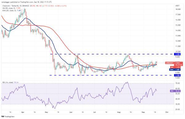 过去几周,Chainlink一直在5.50美元和9.50美元之间徘徊,这表明买家正试图抄底。多头将价格推高至移动平均线以上,RSI也跃升至正区域,表明积极势头可能正在改善。