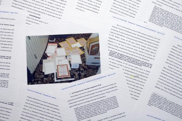 其中包括一张在马阿拉歌庄园的地毯上摊开的一些材料的照片,包括用回针装订的文件的封面页,其中一些标有“绝密//SCI”的亮黄色边框,另一份标有“机密//SCI”的锈色边框。