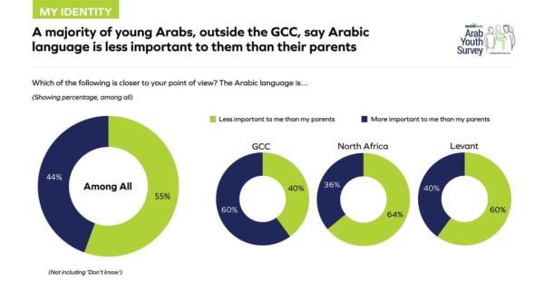 在整个研究样本中,只有5%的人认为阿拉伯语是最重要的因素。超过一半(55%)的人还表示,阿拉伯语对他们的重要性不如他们的父母,尽管只有40%的海合会青年认同这一观点。