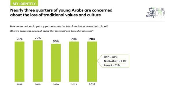 近四分之三的阿拉伯青年(70%)以及海合会、北非和黎凡特地区的明显多数对传统价值观和文化的丧失表示担忧。