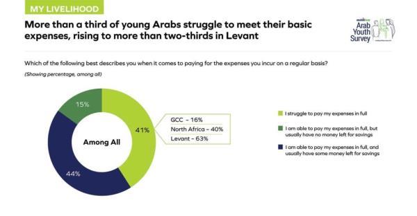 超过三分之一(41%)的人说他们难以满足基本开支(在黎凡特地区这一比例上升到63%),超过一半(53%)的人说他们从家庭获得经济支持。然而,调查结果显示,海湾合作委员会成员国之间存在显著的地区差异,只有16%的国家表示他们很难全额支付支出。