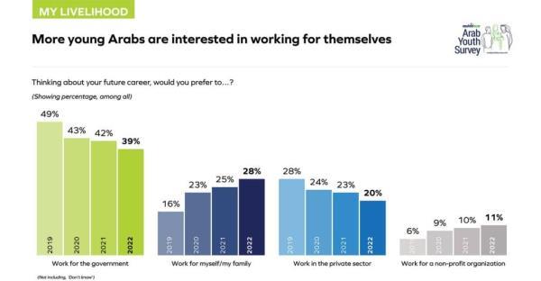 寻找私营部门的比例为20%,在短短三年内再次大幅下降了8%。所有这些都导致阿拉伯年轻人希望自己工作的比例从2019年的16%增加到现在的28%,增加了12%。