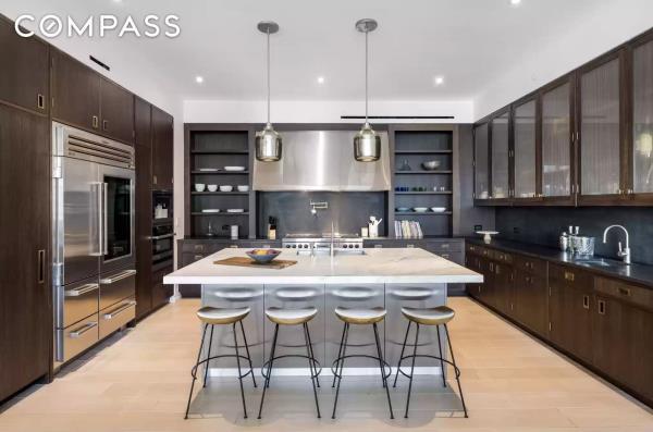 根据挂牌信息,这间厨房的装修是“一台带窗户的Sub-Zero冰箱、两台Miele洗碗机、一台带煎锅的Wolf排气灶、两台烤箱、意大利面锅灌装器、70瓶Gaggeneau葡萄酒冷却器、一体式Miele咖啡机和微波炉/对流烤箱”。