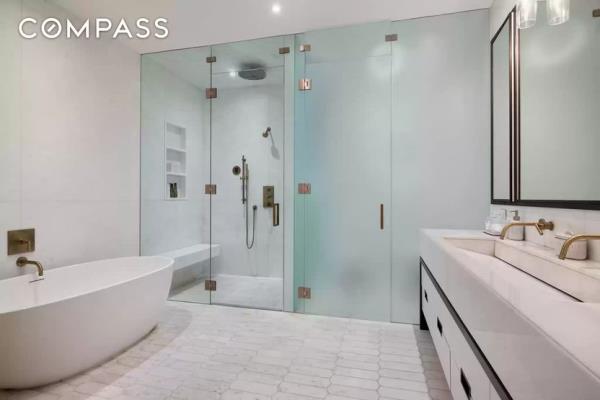 主套房设有步入式衣橱和三个额外的衣橱。套房浴室覆盖着卡拉卡塔大理石,有辐射地暖,一个双梳妆台,一个独立的“鸡蛋浴缸”,和一个超大的玻璃淋浴间。