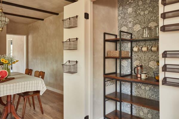 厨房的另一个升级是新的食品储藏室,它的特点是烘焙架架子,水果篮,香料架,和流行的华丽的花卉墙纸。