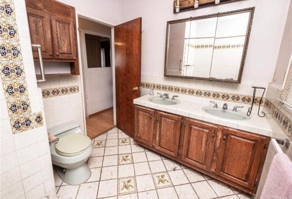 虽然这间房子的主浴室并不大,但装修后的空间看起来大了很多。大量的梳妆台照明、深色地板、大理石梳妆台上的开放式搁板,以及天花板上的淋浴瓷砖,都有助于实现这种视觉错觉。
