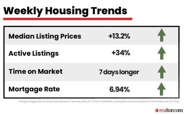 为了解决这个问题,美联储一整年都在积极而无情地提高利率,导致抵押贷款利率从3%上升到6%以上的区间,翻了一倍多。房地美(Freddie Mac)的数据显示,截至10月20日的一周,30年期固定抵押贷款平均利率从上周的6.92%小幅升至6.94%。