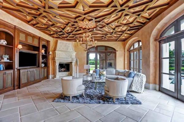 这处奢华的宅邸有着精致的装饰,比如石灰石地板、定制的铁门和栏杆,以及家庭娱乐室的木雕天花板。