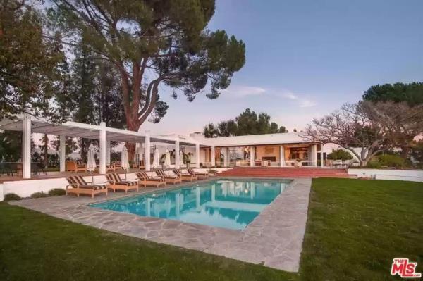 这栋有六间卧室的房子坐落在洛杉矶郊区的一块8英亩的土地上。它配有游泳池、泳池房和2000平方英尺的凉棚。