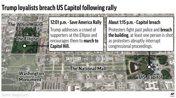 华盛顿(美联社)——周三,一群忠于唐纳德·特朗普总统的暴民冲进美国国会大厦,迫使议员们躲藏起来,这是一次令人震惊的企图,目的是推翻美国总统选举,削弱美国的民主,阻止民主党人乔·拜登取代特朗普入主白宫。
