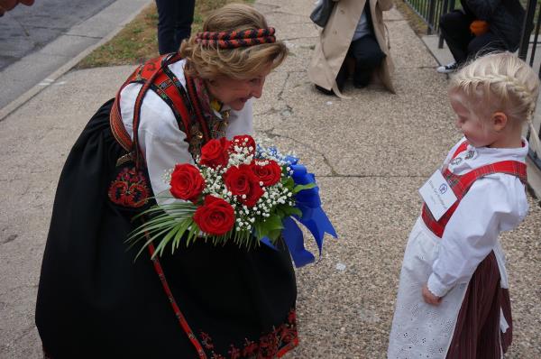 女王Sonja收到了来自4岁的Eline Gro Knatterud的特别问候,她送给女王一束几乎和她自己一样大的红玫瑰。索尼娅王后走到这个敬畏的女孩的视线高度,用英语告诉她,她家里有一件同样的红色传统布纳德连衣裙,然后走进了巨大的石头教堂。