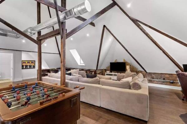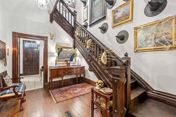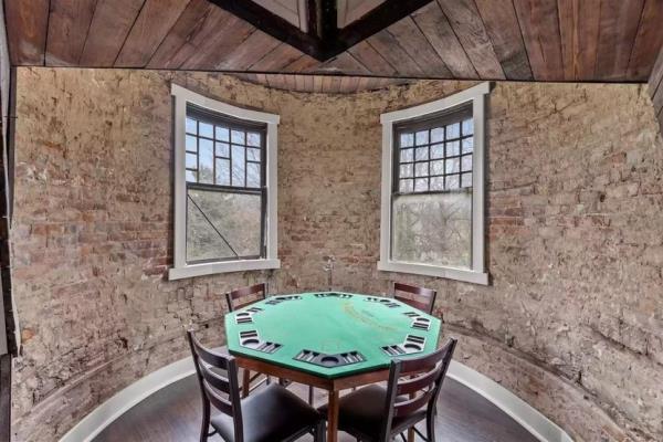 结合了现代设施和复古风格,宽敞而优雅的住宅包括三楼的家庭娱乐室,20英尺高的天花板和裸露的横梁。一个石头砌成的圆形小房间是玩棋类游戏的绝佳场所——或者举办一个séance。