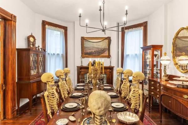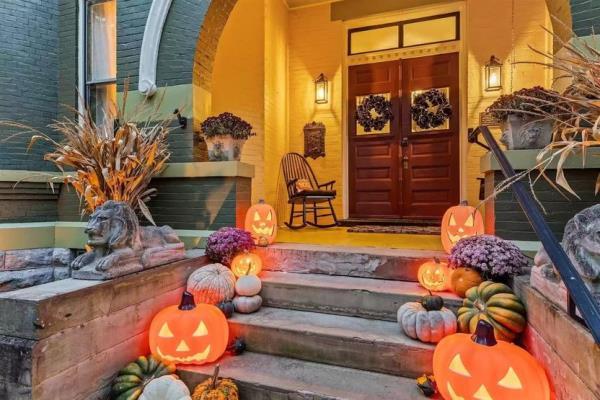 从前门台阶上排列的南瓜灯,到满是狼蛛和女巫帽的大楼梯,这座3868平方英尺的房子的每一寸地方都为这个闹鬼的节日精心装饰过。