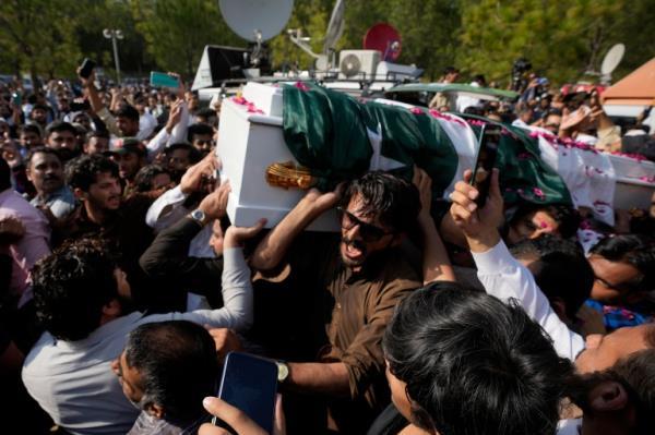 星期四早些时候,他的葬礼在伊斯兰堡的费萨尔清真寺举行。数千人参加了集会,其中许多人举着巴基斯坦和前总理伊姆兰·卡恩领导的巴基斯坦正义运动党(PTI)的标语和旗帜。
