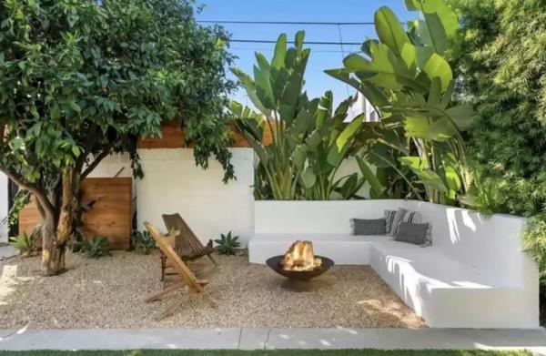 私人后院与可爱的室内非常相配,有许多郁郁葱葱的植物,无需修剪的草皮地面覆盖物,一个燃木披萨烤箱,两个户外起居空间,和一个边院子,在火坑周围有一个内置长凳。