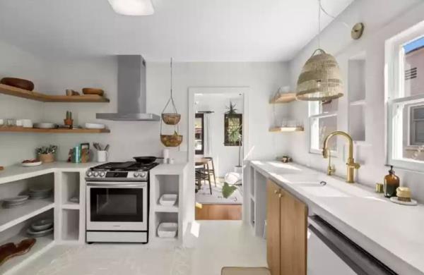 虽然只有1263平方英尺,但由于白色的调色板、优雅的拱门和简单的室内设计,这座房子给人的感觉是开放和宽敞的。