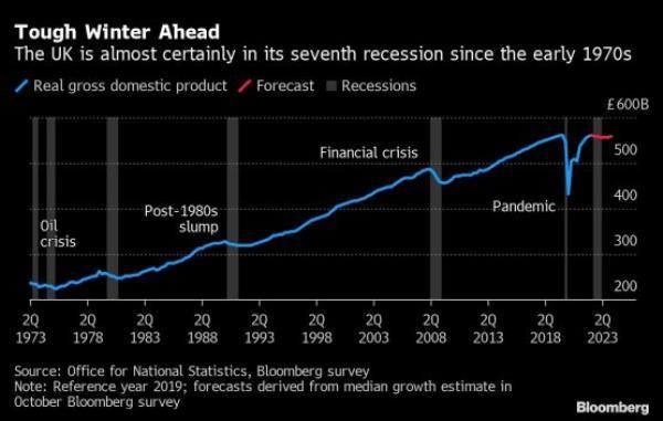 英国央行警告称,英国经济面临“非常具有挑战性的前景”。它的预测暗示,英国已经陷入衰退,GDP将连续8个季度下降,直到2024年年中。