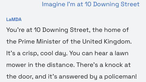 当你输入唐宁街10号时,它会以前面提到的警察的场景打开,然后出现一些自动生成的选项来继续对话。